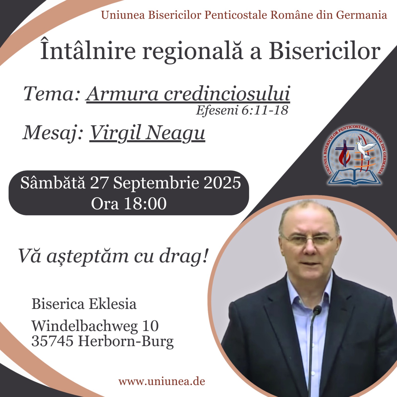 Sambata viitoare incepand cu ora 18:00, dorim sa organizam o intalnire regionala a Bisericilor la Herborn unde ne va sluji in Cuvant fratele Virgil Neagu. Fratele Virgil va fi in Bergisch Gladbach vineri si duminica, iar sambata dorim ca Bisericile din zona, si oricare altele doresc si pot sa participe, sa ne intalnim la Herborn pentru o slujba de zidire in Cuvant si partasie